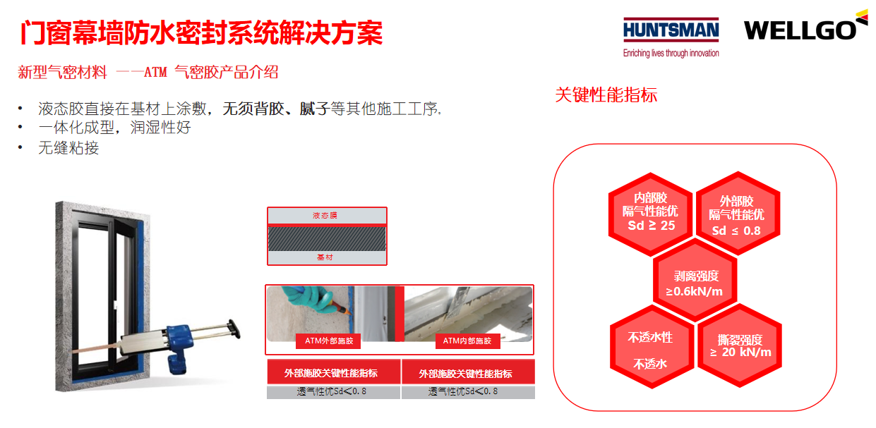 ATM 氣密膠:無需背膠或膩?zhàn)樱瑑?nèi)外部施膠分別實(shí)現(xiàn)隔汽(Sd≥25)和透汽(Sd≤0.8),避免水汽滯留。